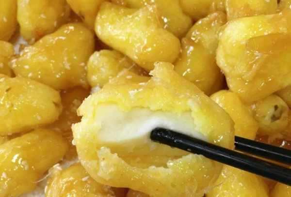 拔絲奶豆腐是內蒙古包頭市的特色美食。拔絲奶豆腐是內蒙古風味名菜。以奶豆腐為主料烹製而成。此菜色澤金黃,口味甜香。拔絲說起來很簡單,拔絲就是指用糖熬成糖稀後,將過油預製的熟料入鍋拌勻裝盤趁熱食用的做法。