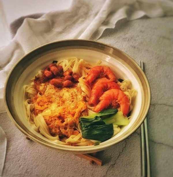 食材:蝦適量,香菇適量,雞蛋適量,白蘿卜適量,面條適量,油適量,鹽適量