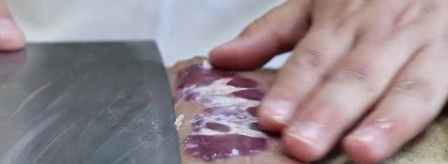 2.豬腰清洗幹凈後,從中間再次片開,片成兩層,打斜刀把豬腰切成腰絲,放入碗中備用;