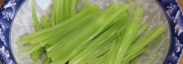 4.輔料準備一根新鮮的萵筍,先把萵筍削皮洗凈,然後把它切成二粗絲,切好的萵筍絲裡面加入適量的鹽醃制起來(順便切一點蒜末和辣椒圈備用);