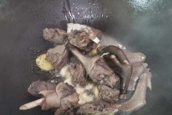 5、生薑和大蒜的香味可以有效去除水鴨中的腥味,所以將薑蒜炒出香味後就可以把焯好的鴨肉也一塊下鍋翻炒。
