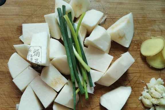 2、凉薯用清水沖洗乾淨,削皮後切成適量大小的塊狀。生薑洗淨切成薑片即可。大蒜去皮洗淨後切成蒜末,葱洗淨切成小段我們等會會用到。