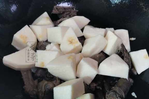 6、把鴨肉和鍋裏的薑蒜炒勻之後,就把準備好的凉薯也一塊放到鍋內開始翻炒。