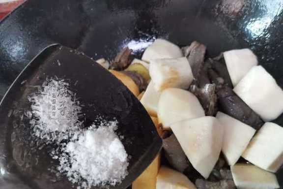 9、炒勻之後,就到了往鍋裏加水的步驟了,加入的水量不要過多,否則就變成熬湯了,只需要加入鍋內食材高度的一半左右即可。