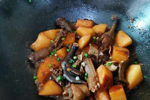 11、直至將這次的凉薯和水鴨完全熬煮熟透了之後,再撒上之前切好的蔥花炒勻,隨後就可以準備關火出鍋了。