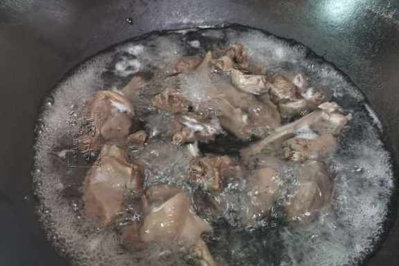 3、把我們這次需要的食材都準備好了就可以開始焯鴨肉了,取出家中常用的炒鍋,往鍋裏加入適量的清水,煮沸之後把切好的鴨肉下鍋焯出多餘的血水以及雜質。焯好之後將鴨肉瀝幹水分撈出即可。
