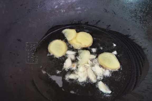 4、此時重新起鍋熱油,往鍋裏倒入適量的食用油後,開大火候將油溫持續加熱至六成左右的時候,就把之前切好的生薑以及大蒜下鍋煸炒爆香,直至可以清晰聞見香味為宜。