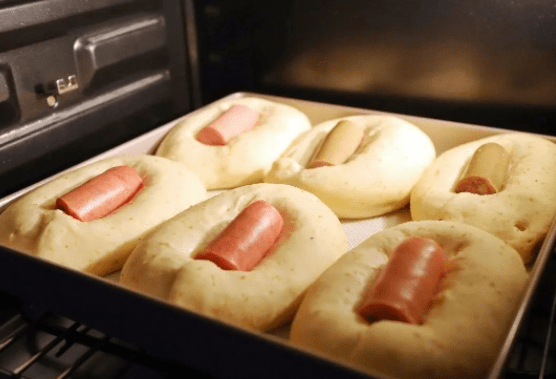 5、中間放入香腸(這裡每個面團用的半根)發酵箱設置溫度38,濕度85,大概50分鐘到2倍大;