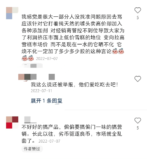 但許多網友依舊不買賬。消費者在意的點非材料,而是因其安靜躺在冰櫃角落最後被選時卻被價格狠狠“刺傷”。大部分網友覺得,鐘薛高價格虛高,即使所用材料沒有問題,但雪糕根本不值此“天價”。畢竟市面上純牛奶的雪糕也基本在5元左右。