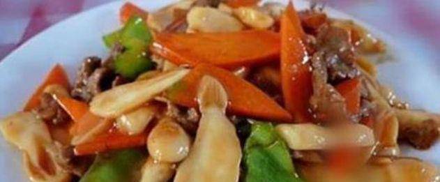 食材:精瘦肉100克,雞腿菇400克,青紅椒各1個,蔥,薑,鹽,油,糖,醋,十三香作料