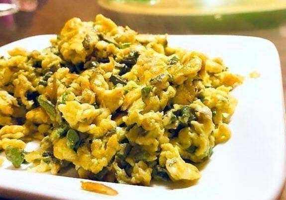 材料:香椿芽一小把、土雞蛋3個、鹽適量、植物油適量、黃酒少許;
