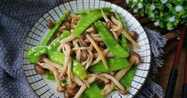 1.蟹味菇擇掉根部,洗凈。放沸水中焯至變軟。撈出瀝幹水分。荷蘭豆擇掉兩頭的筋,洗凈。
