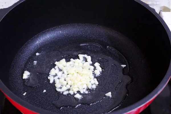 5.鍋中放入適量的食用油燒熱,放入蒜末炒出香味。