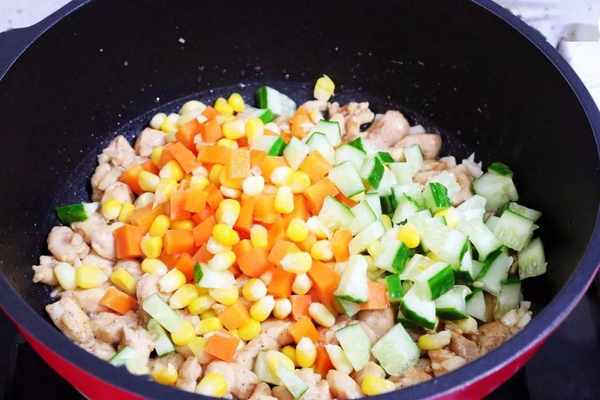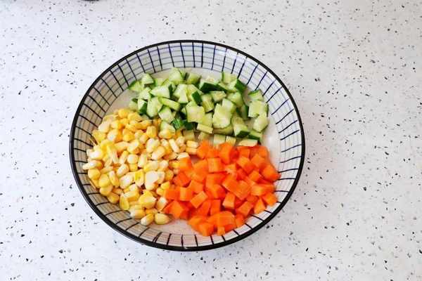 2.黃瓜、胡蘿蔔切丁,玉米掰成粒洗淨控幹水分備用。