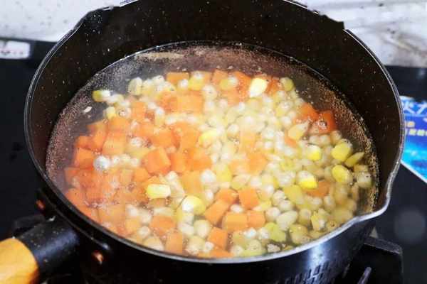 4.鍋中燒開水,放入玉米和胡蘿蔔焯水兩分鐘,撈出備用。