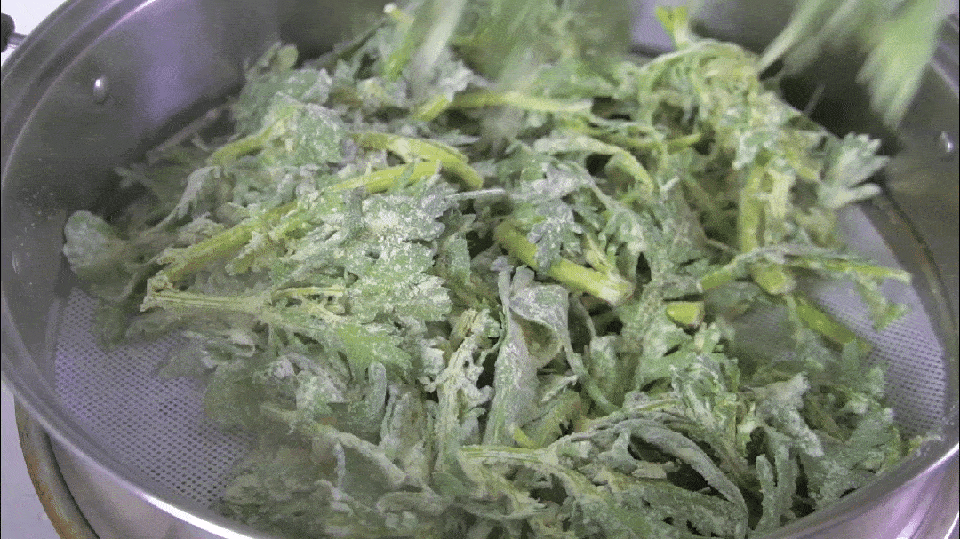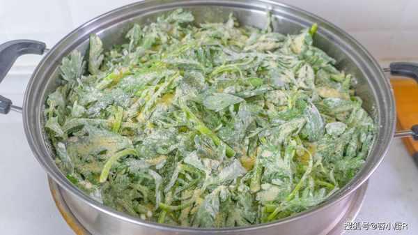 2、水開上汽後,大火蒸5分鐘,面粉蒸熟瞭就可以瞭。蒸茼蒿的時候不要過長,不然顏色就不好看瞭。
