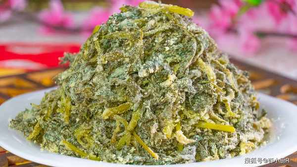3、接著將拌好的面粉撒在茼蒿上面,再輕輕的抓拌均勻,粉不用特別多,茼蒿上能掛上一層,讓粉均勻的裹在茼蒿上。