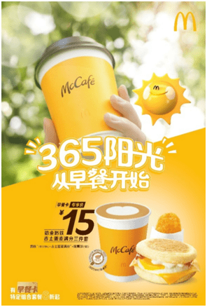 該早餐計劃之所以被叫作“365陽光”,是希望為消費者帶來全新的咖啡早餐的生活方式。“一方面消費者對於早餐的訴求升級,需要營養能量和陽光元氣;同時也來自於麥咖啡陽光小黃杯和太陽蛋麥滿分在早餐的角色,強強聯手提供更高品質、更多選擇的咖啡早餐組合,給顧客提供意想不到的陽光正能量。”麥咖啡業務負責人說。