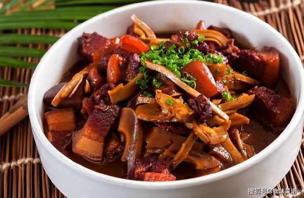 步驟3:加入糖色,4勺生抽,10克冰糖,筍幹,然後加入開水沒過五花肉,放八角和桂皮,小火燉個90分鐘即可。