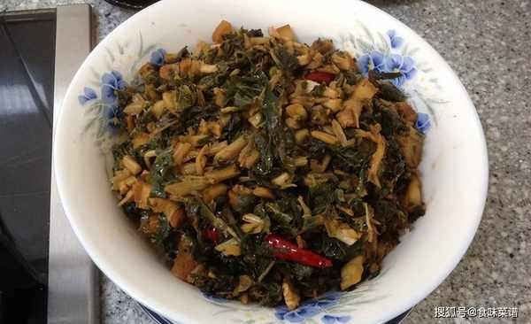 步驟2:鍋中放油,把芥菜幹炒好盛出,然後把剛剛備用料倒入鍋中炒香,再倒入芥菜幹攪拌均勻。
