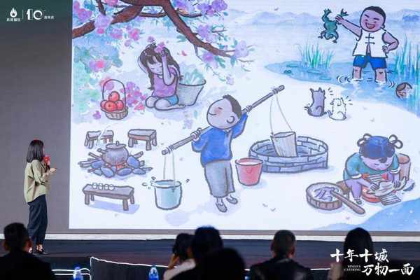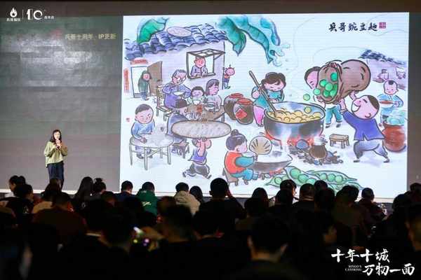 接著,典婆婆向大傢展示瞭一組以兵哥豌豆面為 IP的系列節氣繪畫。以傳統接地氣的畫面感,把原來小時候的回憶,以及有溫度的鄰裡之間的感情,通過四個小夥伴跟周圍鄰裡一起做面,熬制豌豆的場景描繪出來。