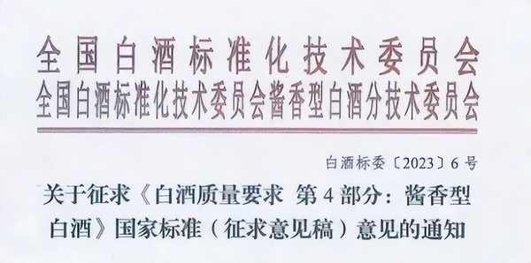 3月1日,相關部門發佈瞭《白酒質量要求第4部分:醬香型白酒國傢標準(征求意見稿)意見的通知》,面向行業部門、協會、銷售、科研等單位廣泛征求意見,截止時間為2023年4月29日。