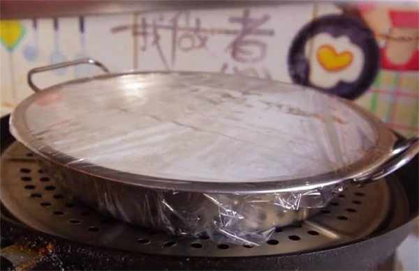 2.再準備一個深點的盤子出來,內壁刷上油這樣防粘,把面糊倒進去,上面給它蓋上一層保鮮膜密封好,如果不用保鮮膜的話,用盤子扣也行,用牙簽紮幾個小孔出來讓它透透氣,直接放蒸屜上,大火燒開,蒸大概15分鐘就行瞭。