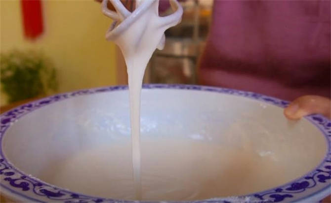 1.250g的糯米粉,再放上50g的玉米淀粉,玉米油60g,先把這些材料攪一攪,然後用300g的熱水和面,這個糯米粉很容易攪好,一直攪到這樣提起來成粘稠的流線狀就行瞭。