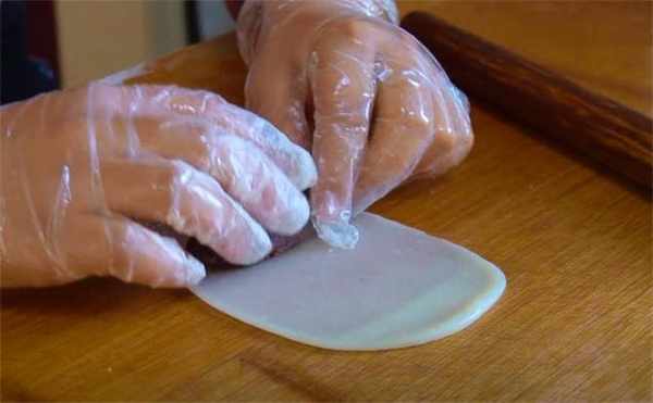 7.撒點面粉防粘,按扁後搟成長方形的餅皮,準備點豆沙餡放在一邊,然後卷起來。