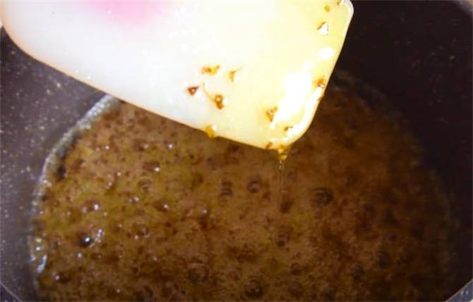 4.大火直接煮開,熬到湯汁濃稠的程度,給大傢看一下狀態,它不斷冒密集小泡,提起來這個糖液非常粘稠的狀態就可以瞭。