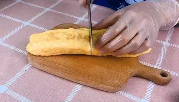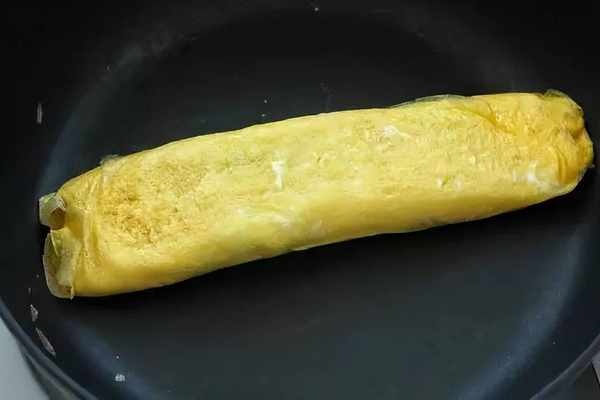 同樣的方法將最後1/3蛋液卷好,兩面稍微煎至一會使蛋卷定型,取出晾溫後再切塊狀食用即可。