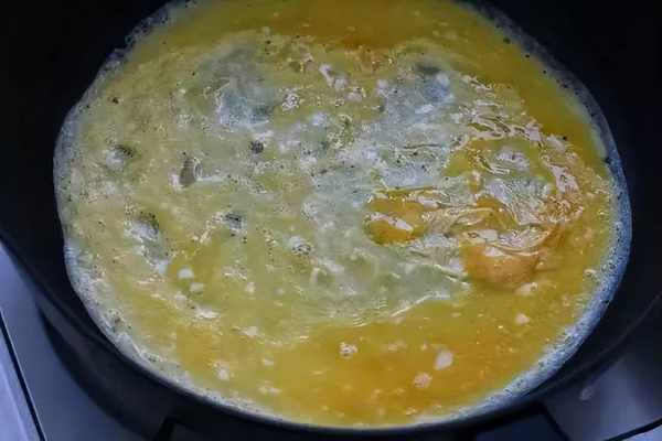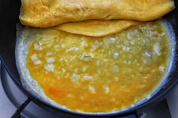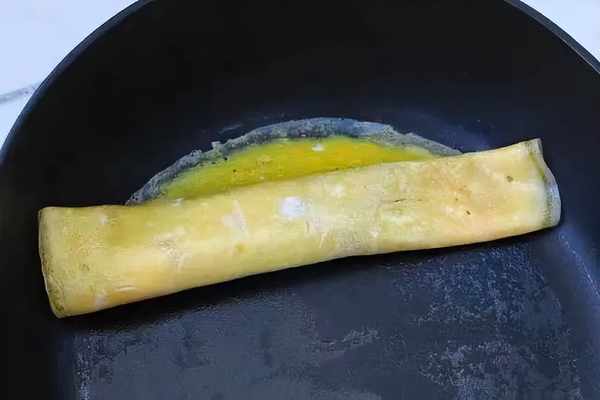開始卷蛋皮,用鍋鏟或刮刀把秋葵一側的蛋皮挑起來包裹住秋葵慢慢卷起到鍋的另一側。接著倒入1/3的蛋液鋪滿鍋底,還是等蛋液表面沒凝固時再卷回來。