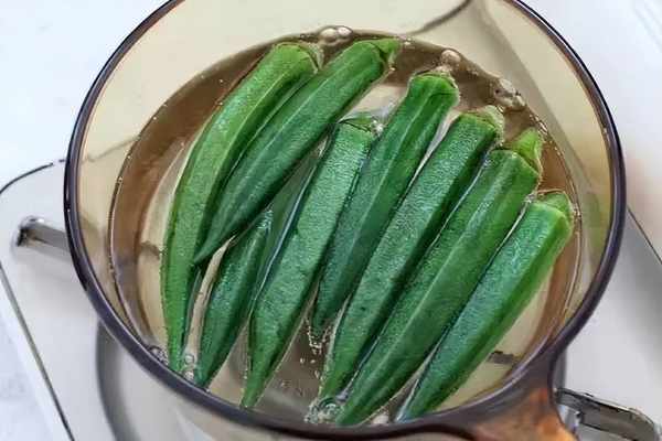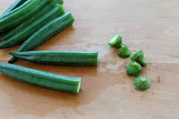鍋中燒開水放入秋葵焯燙約1分鐘,待秋葵顏色變得翠綠撈出過涼水,然後切去根部。