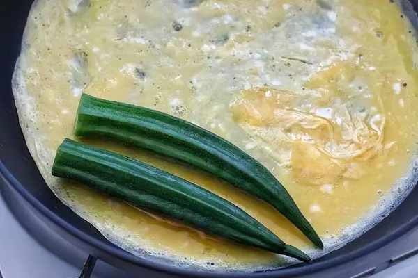 平底不粘鍋裡放少量食用油,用油刷刷均勻後開小火,倒入1/3的蛋液輕輕轉動鍋子,使蛋液鋪滿鍋底,在表面蛋液還沒完全凝固時將兩根秋葵排放在一側,也可以排放四根秋葵