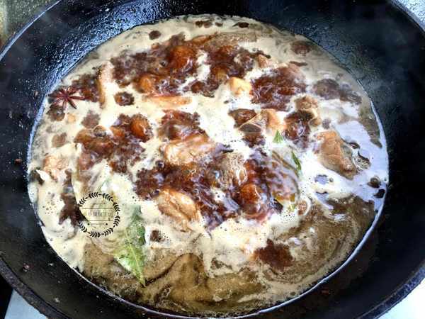 3、上完糖色後,加入焯燙好的肉類翻炒上色,後期加水的時候一定要加開水,如果加入涼水會使肉質變得幹柴,不易燉爛且影響口感。