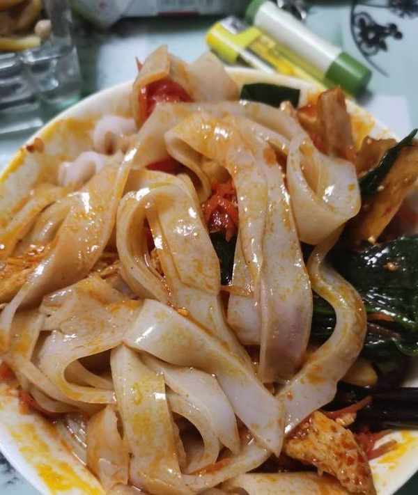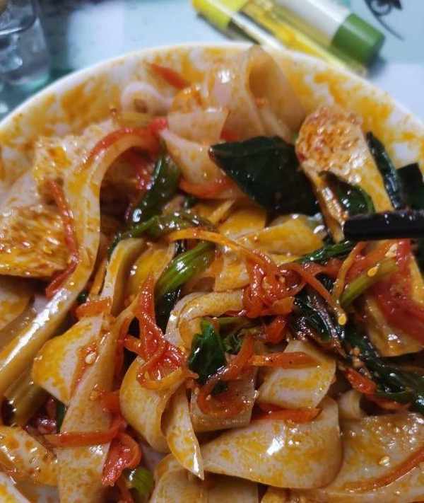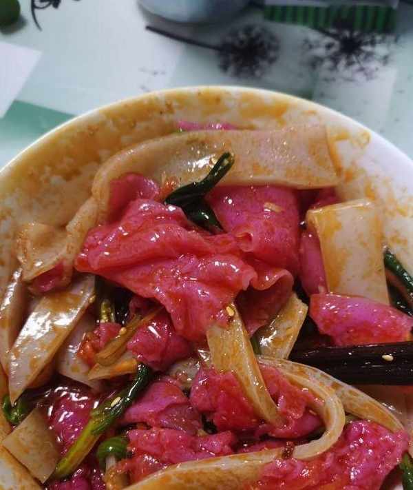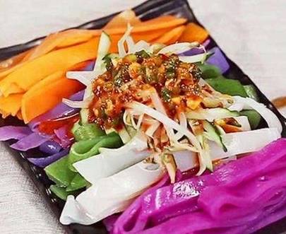 調制涼皮,這一步很關鍵。切成條的涼皮,放入配菜(菠菜,豆芽,黃瓜絲等),加入鹽,味精,雞精調料水,薑汁,蒜汁,香醋,最後加入涼皮的靈魂,秘制油潑辣子即可。