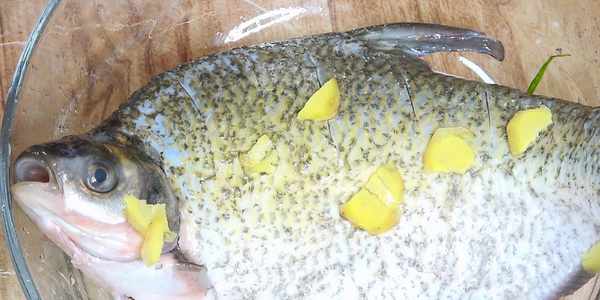 然後把魚放進一個大碗裡,準備一點蔥薑搓爛,塗抹一下鯿魚,這樣可以有效地給魚去腥,完全不用加料酒。個人覺得加瞭料酒反而會影響魚肉的鮮味,當然,每個人都有自己做菜的習慣,根據自己的習慣來就可以瞭。魚腹裡也要塗抹一下。然後把蔥薑裝一些在魚腹裡,放在一醃制5分鐘。