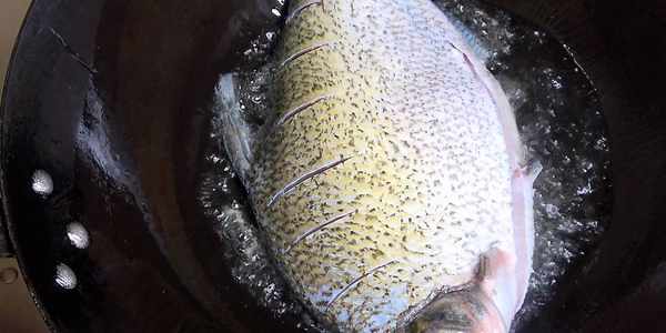 接著再次往鍋裡倒入一些涼油,燒到三四成熱,把鯿魚放進去。先不要動它,煎個七八秒鐘,然後轉動鐵鍋,把魚頭和魚尾都煎一下,讓整條魚受熱均勻。保持中小火煎,火一旦確定之後就不要去調它,忽大忽小的火也會影響煎魚的效果。