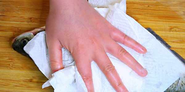 這時候的鯿魚也已經醃好瞭,然後把蔥薑去掉不用,用廚房紙把魚上的水分擦幹,裡裡外外都要擦幹,這樣煎魚的時候才不易破皮。想要煎出完好無損的魚,這一步是必不可少的。