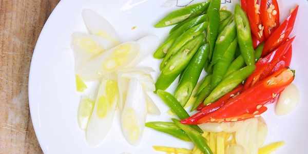 醃魚的時候來準備配料,幾顆大蒜切片備用,一點生薑也切成薄片。兩根綠色二荊條辣椒斜刀切成小圈備用。這個二荊條隻有一點點的辣味,一點辣都不能吃的朋友可以不加。兩根紅色二荊條也是斜刀切成小圈,加紅色辣椒主要是為瞭好看。大傢也可以把二荊條換成大青椒和甜椒。一小段大蔥斜刀切成片。雖然現在大蔥的價格很貴,但是不加大蔥還是缺點味兒,成都的大蔥8塊一斤,不知道算不算貴。