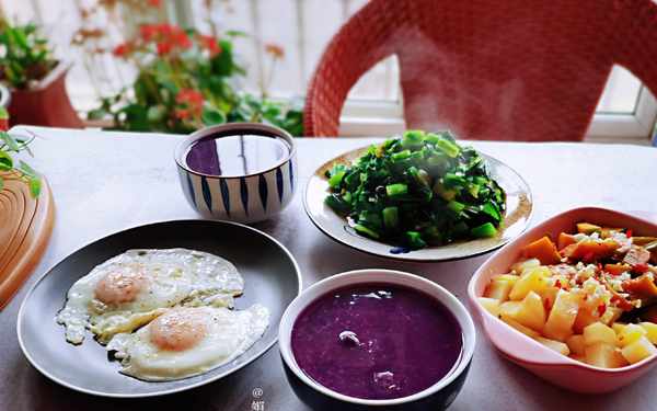 四、紅豆薏米漿+饅頭和紫薯+菠菜炒雞蛋紫薯軟糯香甜,花青素含量很高,富含纖維素,當主食吃即飽腹又可保持腸道暢通,利於腸道健康。煮紫薯的鍋上面放蒸屜蒸加熱饅頭,食物多樣粗細糧搭配飲食更健康。