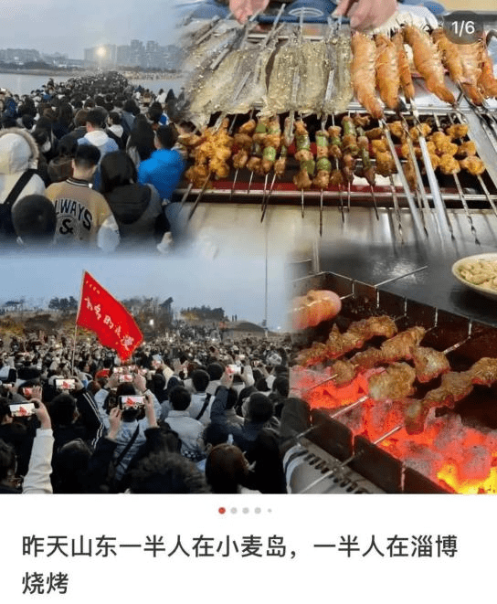 也有一位UP主同樣寫道,最近在山東旅遊的年輕人,一半在小麥島,還有一大半已奔向瞭淄博吃燒烤。