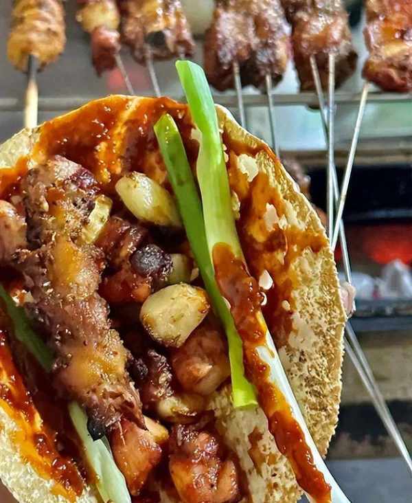 大傢一起圍在燒烤小火爐旁,掌心攤上面餅,將烤熟的肉串一把攥下,再配上青白脆嫩的山東大蔥,至此,一道美味十足的淄博燒烤就完成瞭。