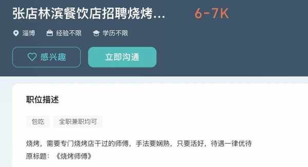 有人去招牌網站搜索淄博燒烤師傅相關招聘,發現當下淄博燒烤師傅的工資已經漲到瞭七千元,差不多可與一線城市廚師媲美。