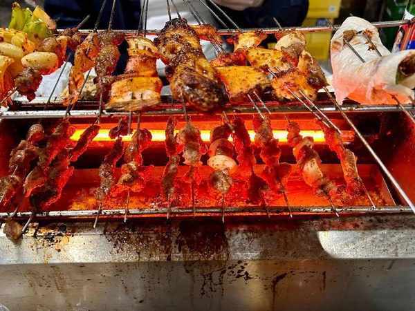 但淄博燒烤不同,淄博燒烤的烤串需要燒烤師傅烤至七八成熟,然後再端上顧客的餐桌,讓顧客在小爐子裡繼續烤。