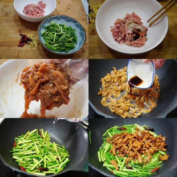 1、蒜薹處理幹凈洗凈切段,裡脊肉洗凈切絲,準備薑絲、幹辣椒。