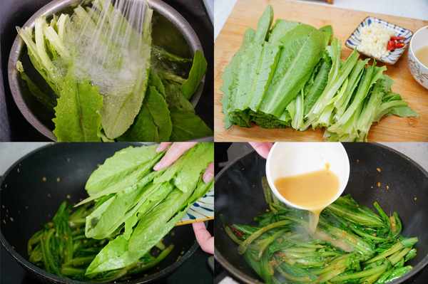 3、炒鍋加油,油熱後倒入蒜末和幹辣椒炒香,倒入油麥菜莖翻炒均勻,加入油麥菜葉。