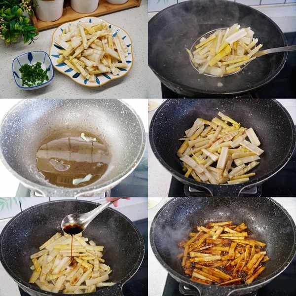 3、一勺豬油放入炒鍋中,加熱融化後倒入春筍,煎至微軟。