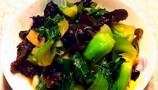 3.放入事先用水焯好的小油菜,翻炒2分鐘,加入已熟的黑木耳。