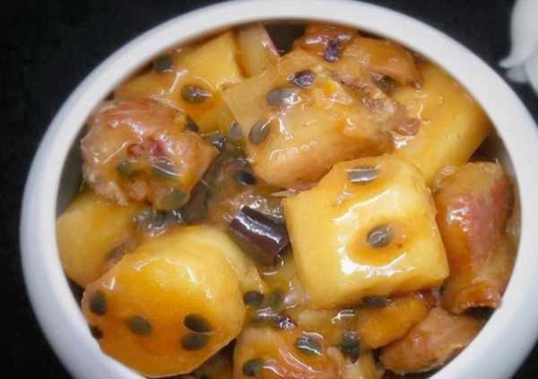 3、蓋上蓋子中小火燜煮大概20分鐘。待湯汁有點濃稠時加入百香果汁翻拌均勻,然後根據個人口味加入適量的白砂糖進行調味就可以出鍋瞭。